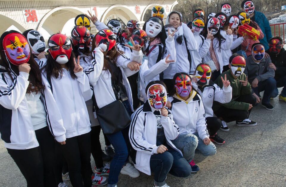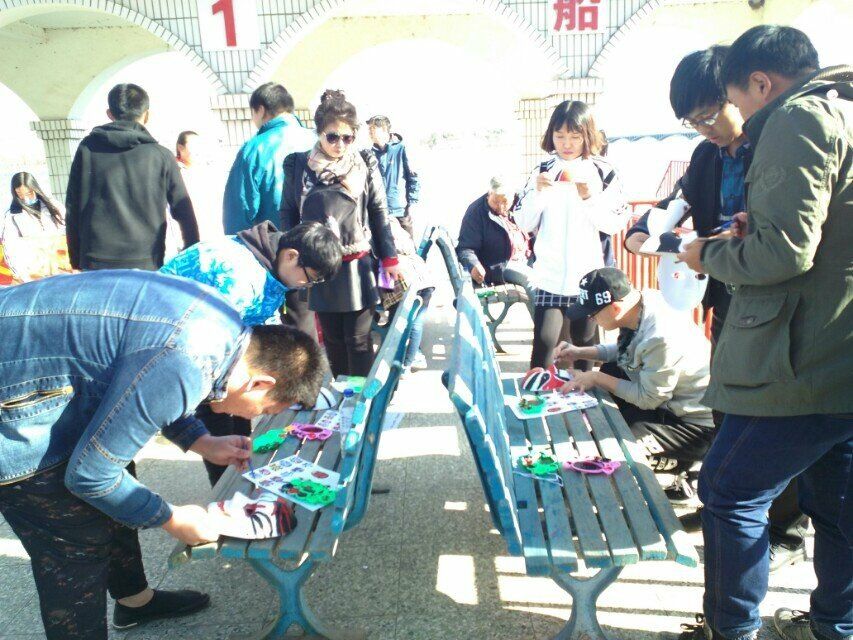 在南湖公园,同学们积极向市民解说京剧,公园内参与活动的人群情绪高涨。大家一起调颜料,观察脸谱的细节特点,把独一无二的作品与游人分享。