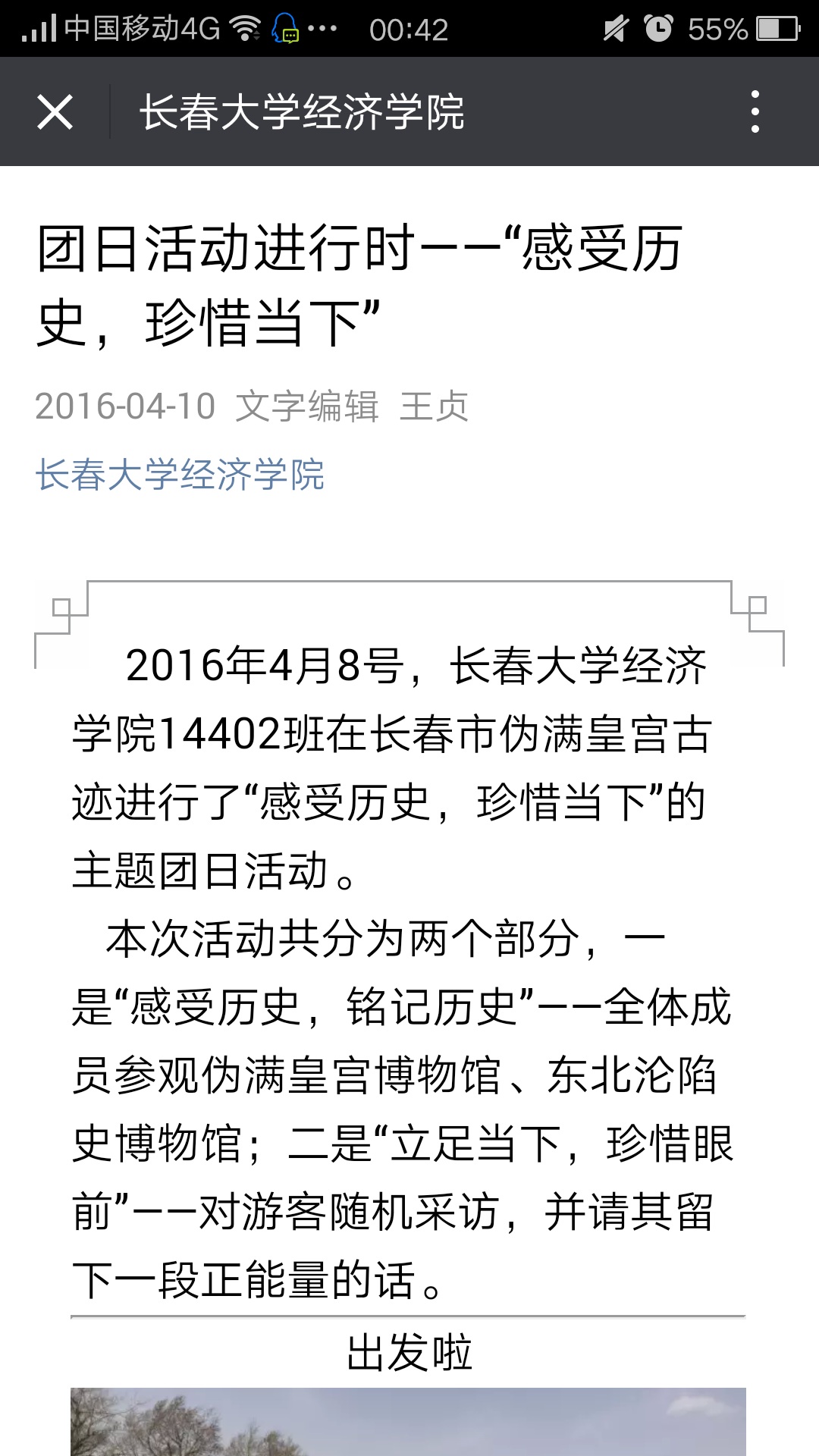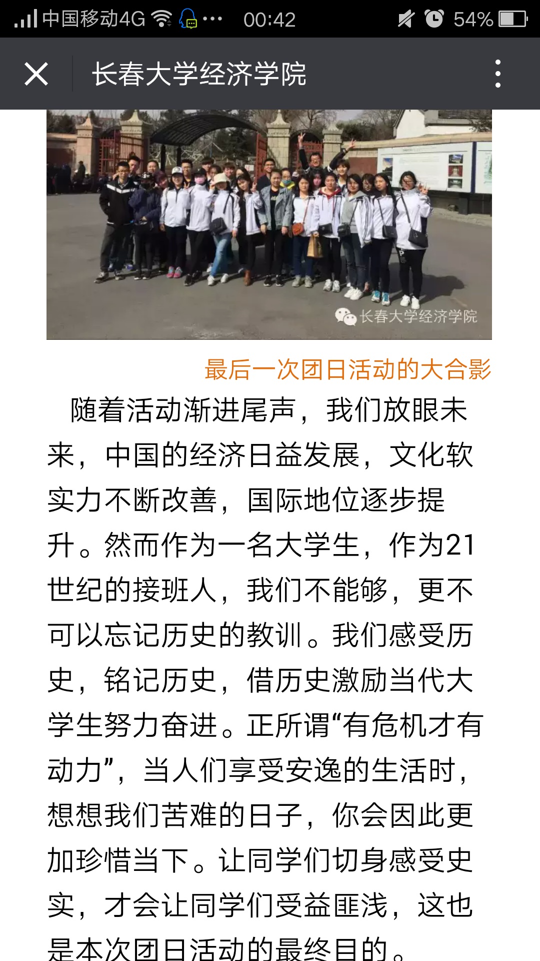 2016年4月8日,开云kaiyun体育14402团支部同学在长春市伪满皇宫进行了“感受历史,珍惜当下”的主题团日活动。开云kaiyun体育团委组织部、网络信息部学生干部,以及本班36名同学全程参加了此次活动。