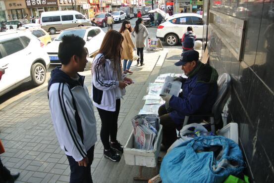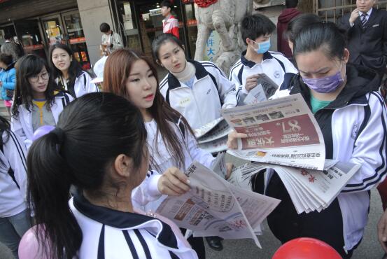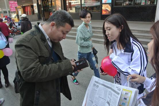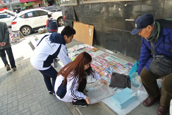 在长春市桂林路,同学们分成两组,一组同学准备调查问卷,采访当今社会人们对献爱心的看法,鼓舞更多的人关爱弱势人群。二组同学帮助老人卖报纸。