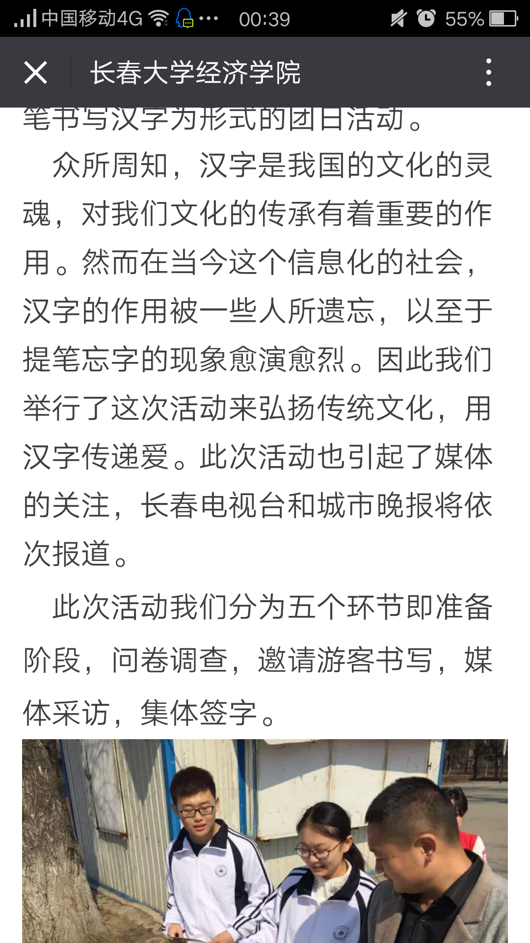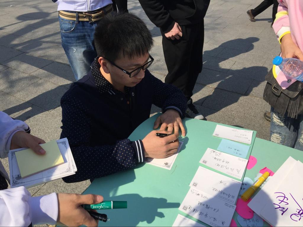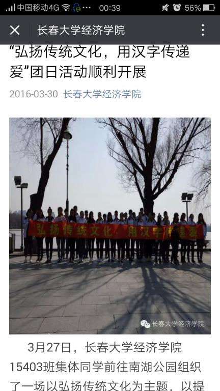 2016年3月26日,开云kaiyun体育15403团支部在长春市南湖公园举办了以“弘扬传统文化,用汉字传递爱”主题团日活动。
