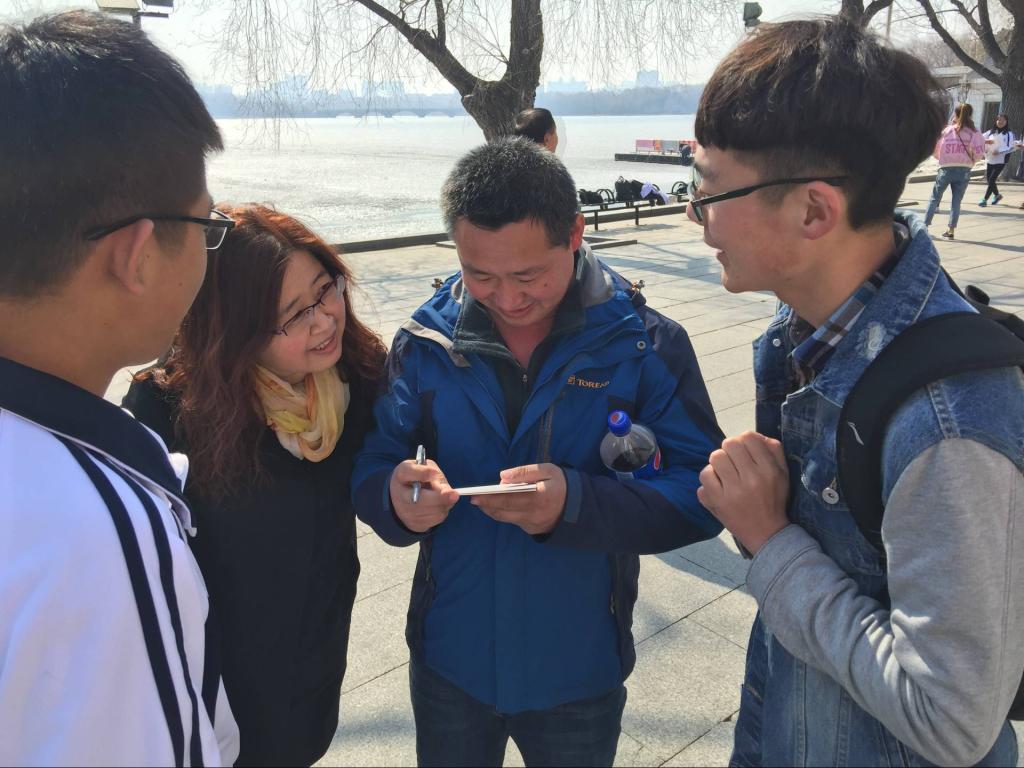 在南湖公园,同学们向市民分发题为“今天,你写字了吗?”的调查问卷。