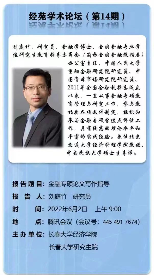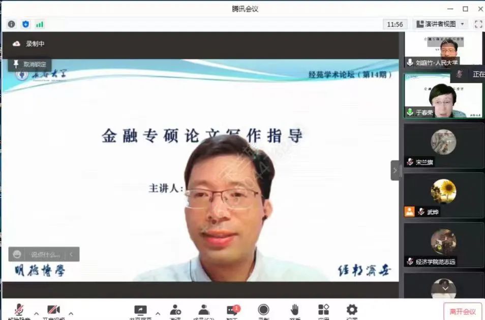 2022年6月2日,学院举办了第十四期经苑学术论坛。本期论坛特别邀请了全国金融专业学位研究生教育指导委员会(简称全国金融教指委)办公室主任,中国人民大学重阳金融研究院研究员刘庭竹博士以“金融专硕论文写作指导”为题进行了学术分享。