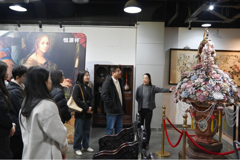 联盟核心成员单位恒源祥集团拥有百年历史的民族企业,其深厚的红色基因、坚守的工匠精神与创新的发展理念,成为联盟的核心育人资源。当天下午,在恒源祥集团党委书记顾红蕾及工作人员的带领,beat365官方网站发展对象先后参观了企业历史陈列馆与文化展示中心。从抗战时期支援前线的爱国事迹,到改革开放后引领行业的创新实践;从非遗绒线编结的冬奥颁奖花束,到“同心向党共绣党旗” 的红色文创;从 “恒爱行动” 的公益温暖,到多届奥运制装任务的荣耀时刻,发展对象通过实物展品、文献资料与现场讲解,深入了解了这家百年企业“守匠心、传文脉、担使命” 的发展历程。