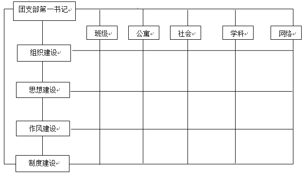 紧紧围绕团建的四个方面即组织建设、思想建设、作风建设和制度建设,在设计班级团支部自选模块过程中,将党建进公寓、进社团、进班级、进学科、进网络作为主要内容,供其选择。(附“矩阵式”工作模式图)